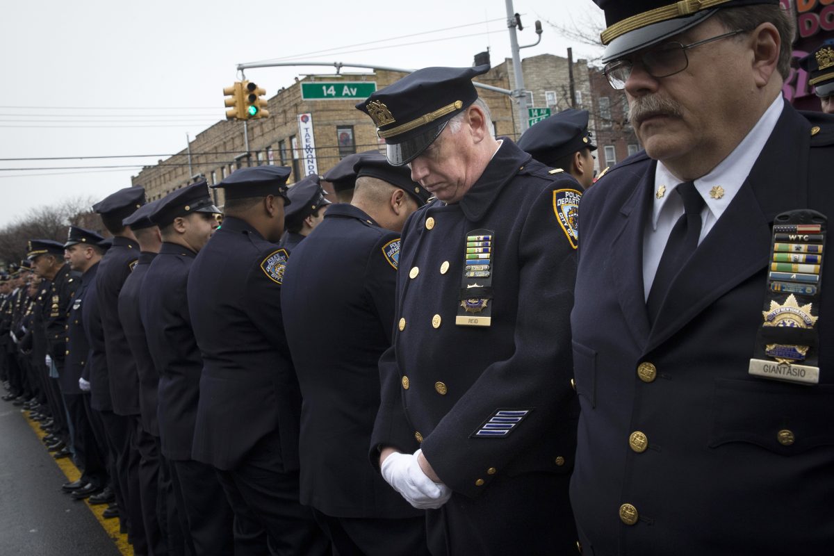 Officers spun back around when Bratton took the podium to speak. Later, de Blasio stood outside the funeral home, to no visible reaction from officers, observing an honor guard and other rituals.