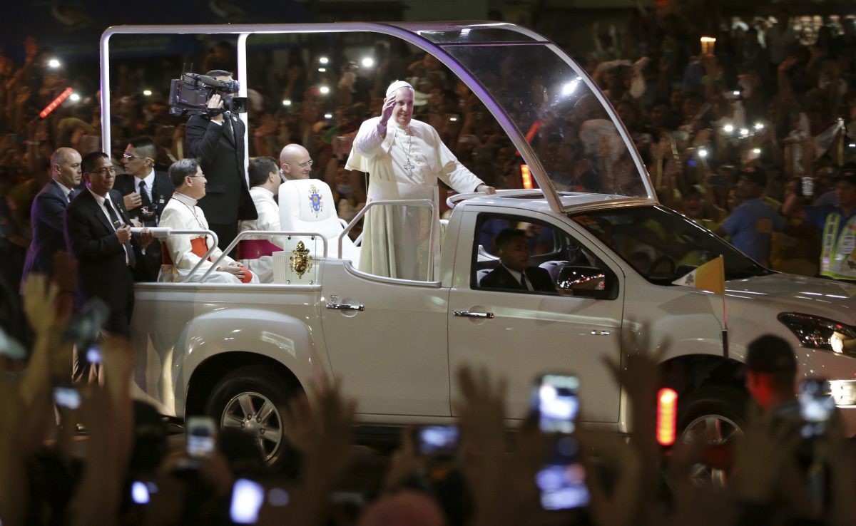 Francis then boarded his white, open-sided popemobile and his motorcade began rolling along the 6.8-mile route to the Apostolic Nunciature in Manila, where he will stay.