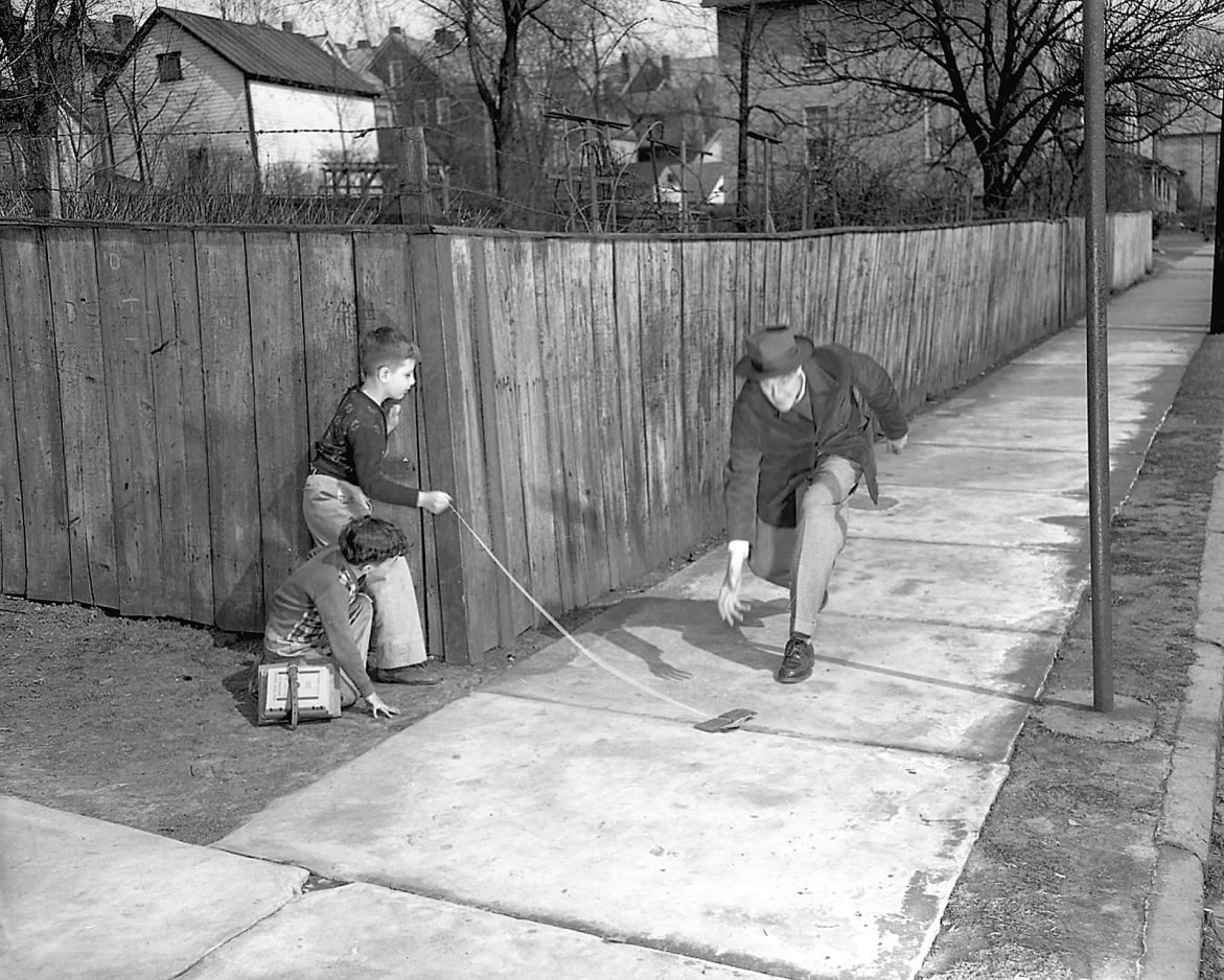 Henry, 79, recalled that it was an April Fools’ Day prank set up by newspaper photographer Ron Christman and he is the boy holding the string. He said the photo was taken on the east corner of Houston Street and LeMoyne Avenue in Washington, the sidewalk stretching toward Elm Street.