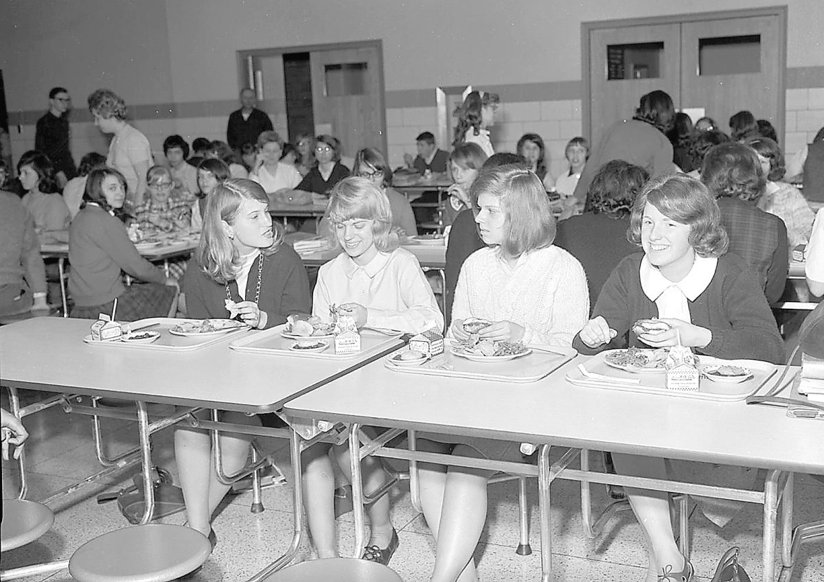 The clothing seems to date the photo to the late 1960s, when high school cafeterias provided little or no choice. Under magnification, these girls appear to all be dining on sloppy joes, green beans, potato chips, dessert and white milk. How well would that menu be accepted today?