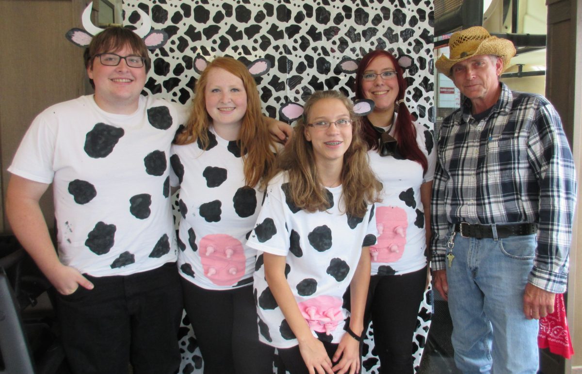 The group of four from Eighty Four wore matching white T-shirts whith black painted spots and ears. The girls wore homemade udders, and the lone bull, Ian Matthews, wore horns.