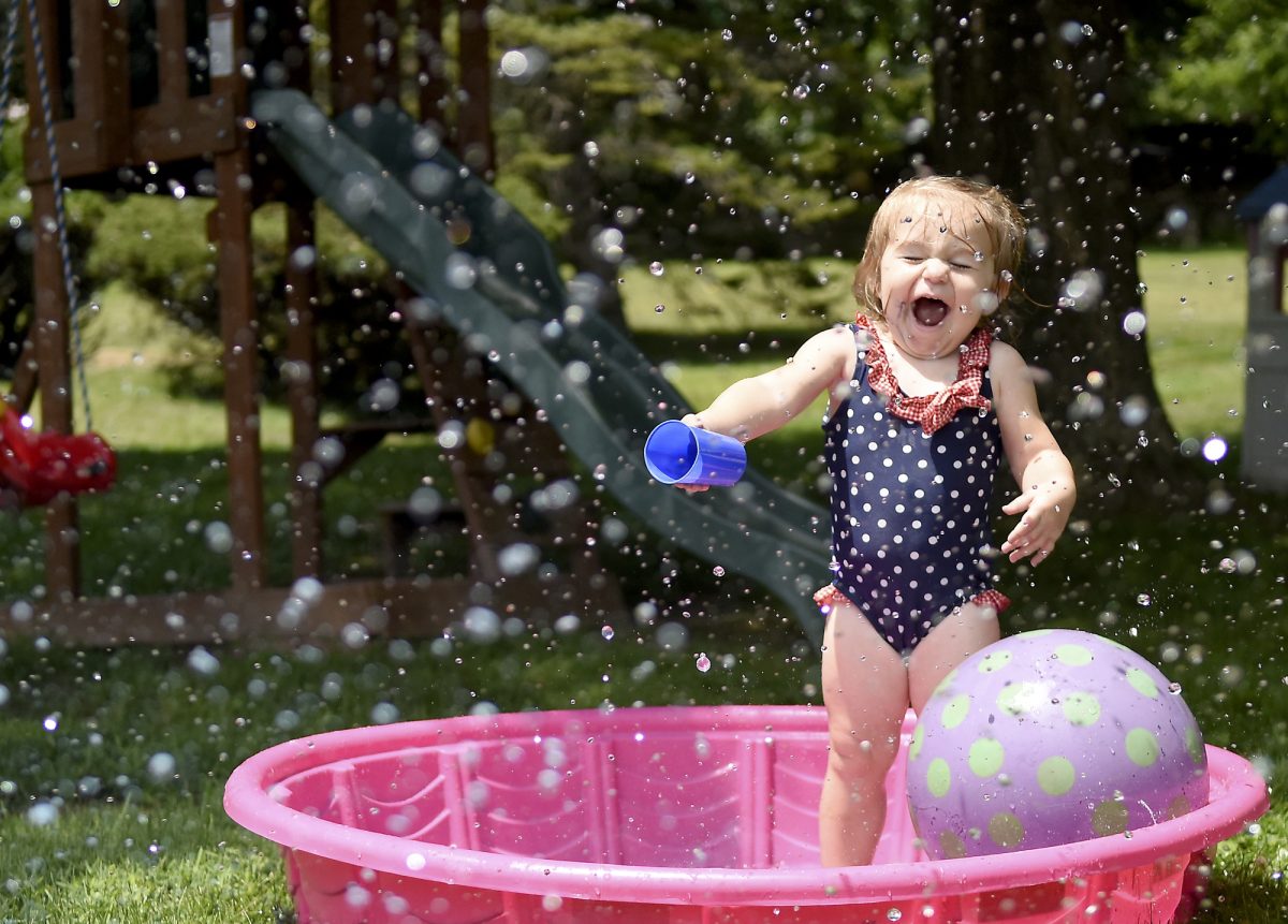 Emmy Bissett, 2, laughs and plays in the water while her mother sprays her with a hose Monday in North Franklin Township.