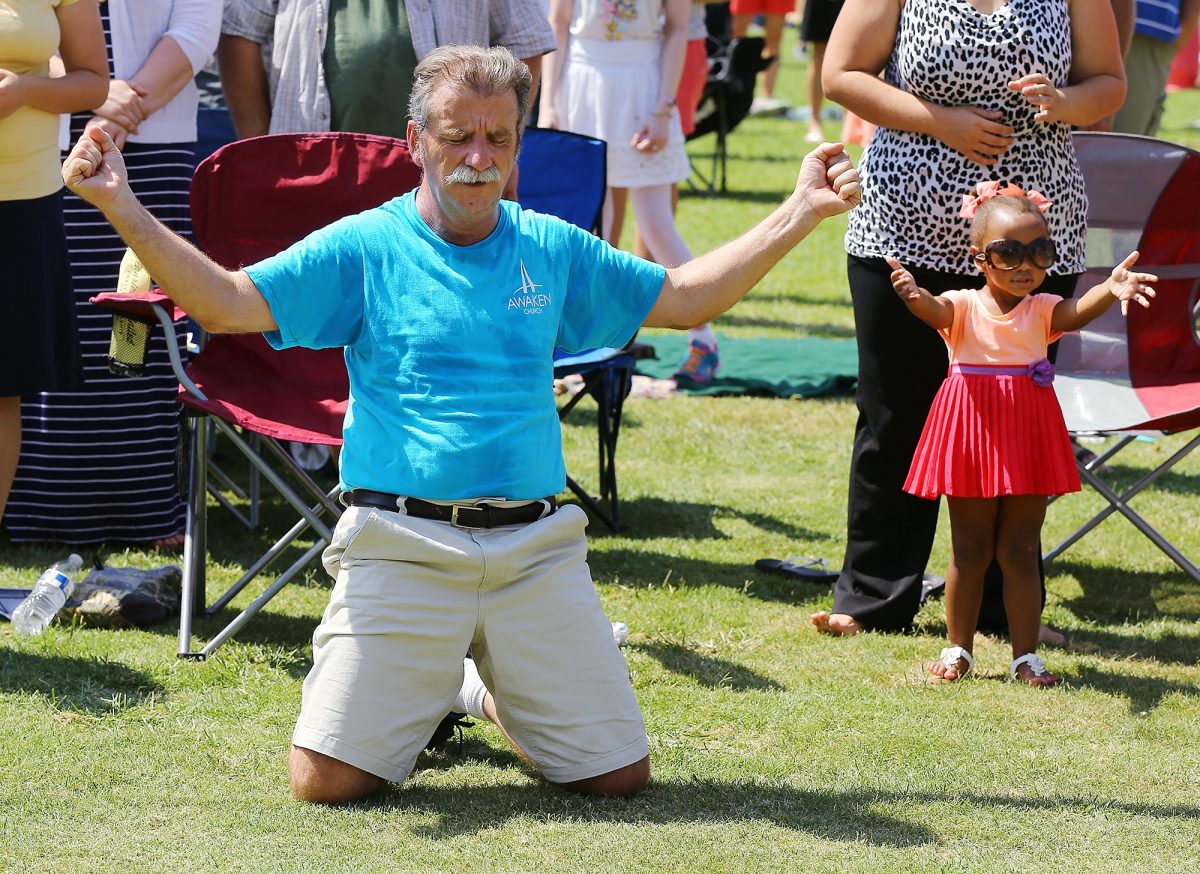 Despite the heaviness in the air, many stood – some holding small children – to shout their praises or raise their hands toward the church’s vaulted ceiling. For added security, police officers stood watch over worshippers.