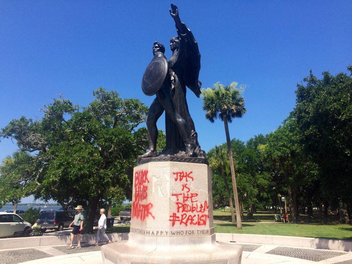 Less than 2 miles from the church, someone vandalized a Confederate monument, spray-painting “Black Lives Matter” on the statue. City workers used a tarp to cover up the graffiti, police said.