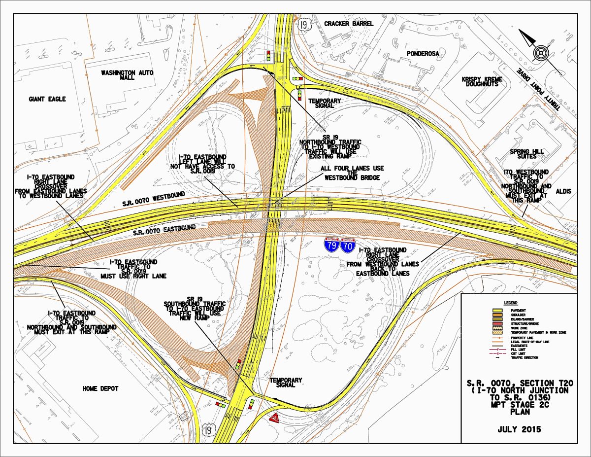 Drivers who want to exit the highway at either the Murtland or East Beau Street interchanges will have to stay in the right lane as the left lane will cross over to the westbound side of the highway just east of the north junction and stay there until it crosses back over east of the East Beau interchange. Traffic from I-79 south to I-70 east will be directed onto the right lane of the interstate. Both westbound lanes will remain on the existing westbound lanes and not use any crossovers.