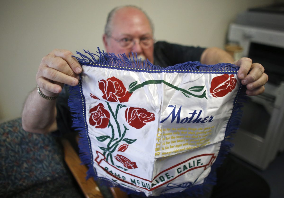 The white pillow cover has a blue fringe, and in addition to the word “Mother” in blue, is decorated with red roses with green stems, and the words “Camp McQuaide, Calif.,” where O’Gara was stationed.
