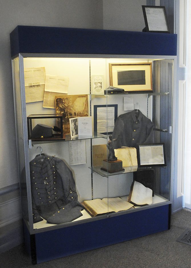 Exhibits in the museum include an original cadet uniform, old classroom desks and photographs. Issues of the “Trinity Record” and “Trinity Dude” newsletters from 1886-87 are yellowed, but still legible in their respective cases.