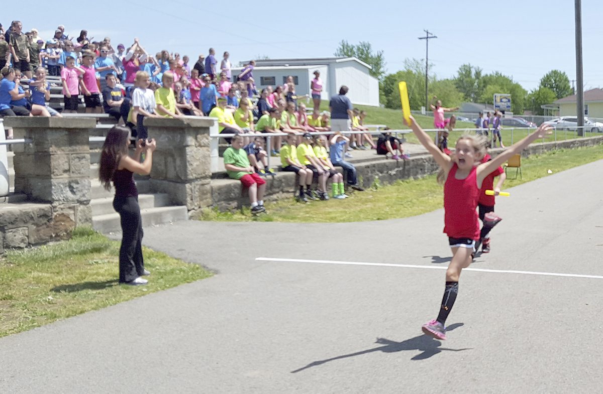 Also pictured, Sophia Zalar raises her hands in triumph as her team wins the long distance relay race.