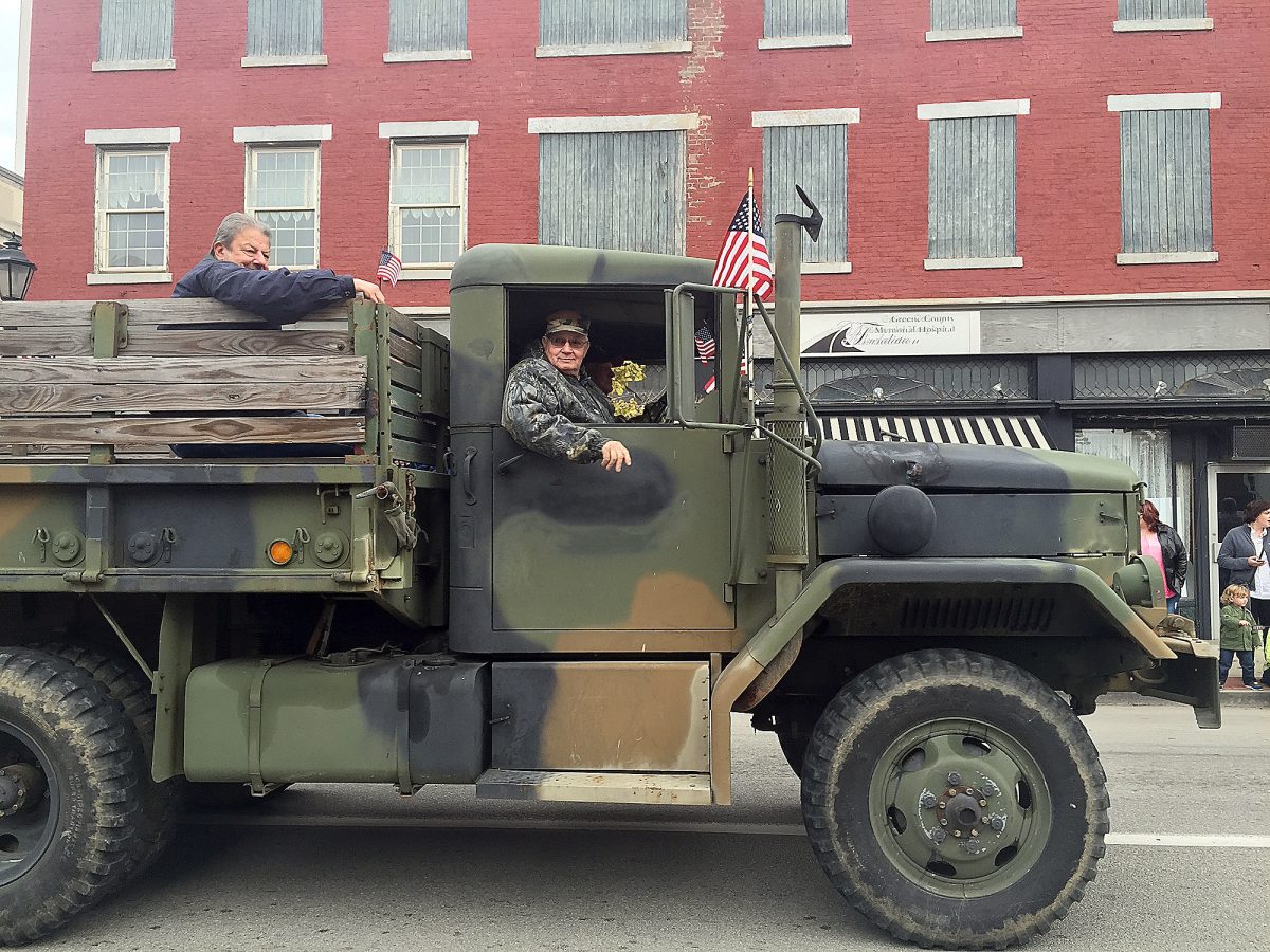Veterans Monk Milovac, left, and Bob Huffman ride Saturday in a World War II deuce-and-a-half utility truck in the Veterans Day parade in Waynesburg.