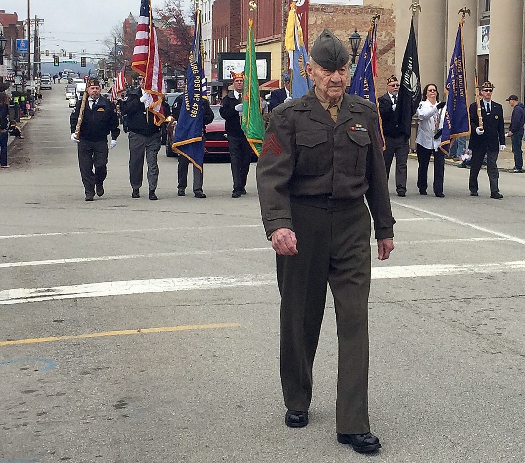 World War II Marine Veteran Bill Wright marched with the Veterans of Foreign Wars Waynesburg Chapter 4793 in the Veterans Day parade in Waynesburg Saturday.