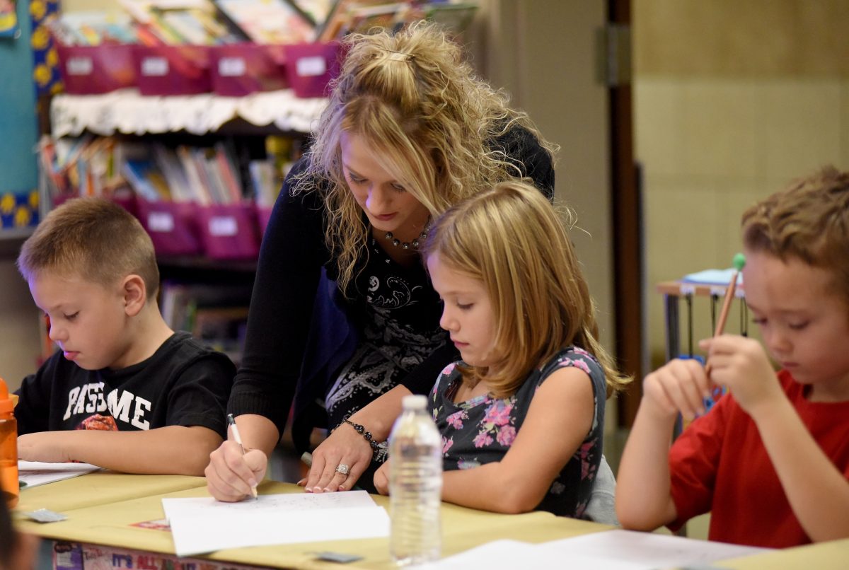 Second-grade teacher Jessica Mascara stood at the smart board at the front of her Muse Elementary School classroom and demonstrated how to write a proper cursive “i.”