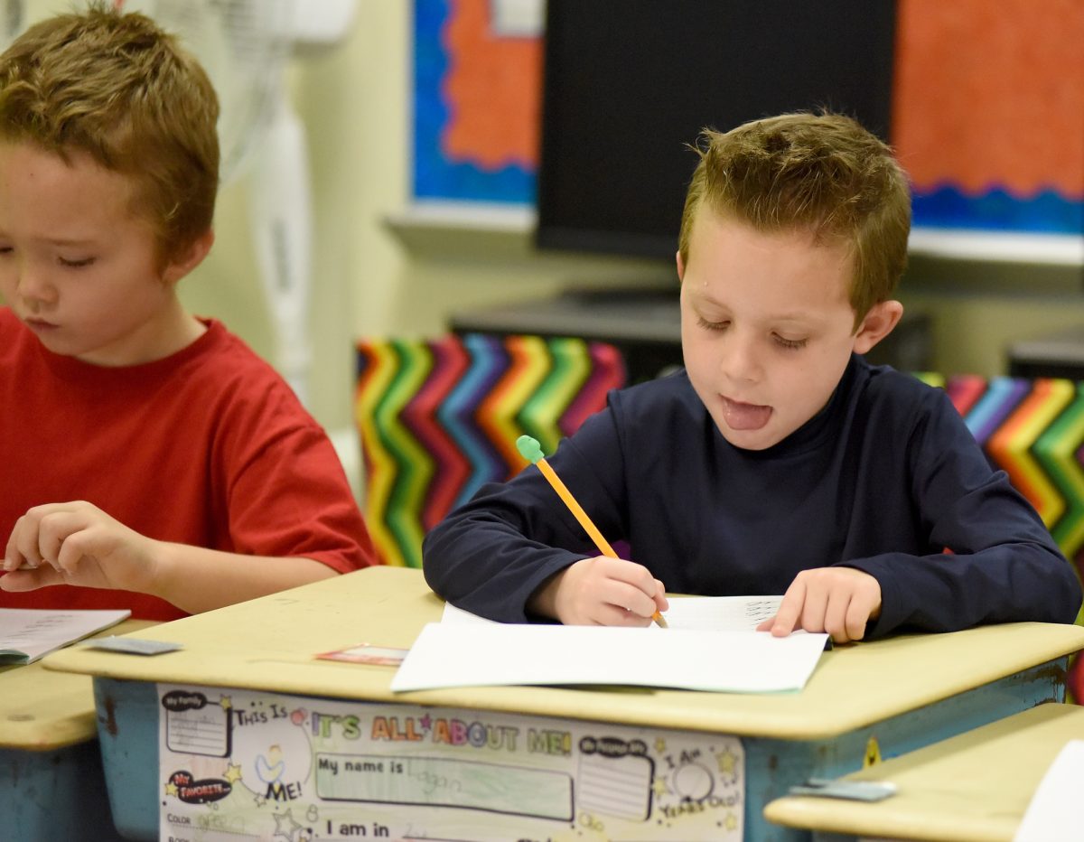 The boys and girls watched Mascara write the lower case “i” and then leaned over their workbooks, which like Mascara’s smart board had three lines – top, middle, and bottom.