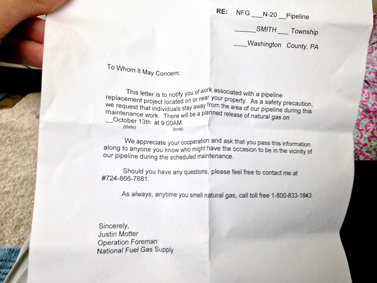 A letter from National Fuel was delivered Monday to neighbors on Phyllis Road, which read, in part, “We request that individuals stay away from the area of our pipeline during this maintenance work. There will be a planned release of natural gas on Oct. 13 at 9:00 a.m.”