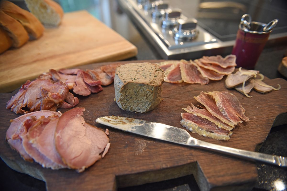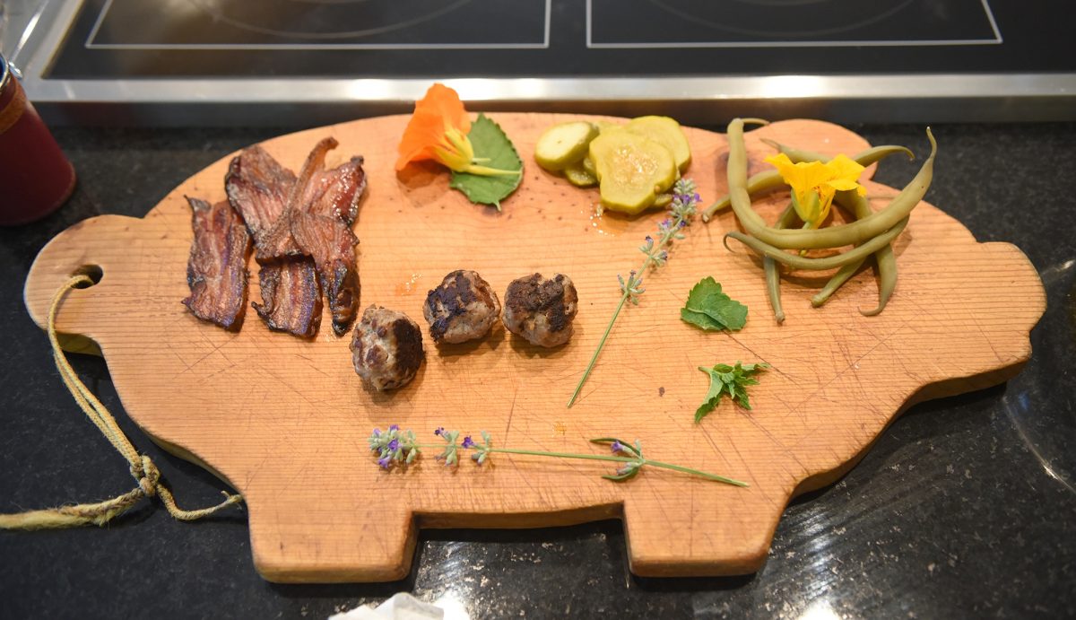 One of Bob’s three pigs – Bricks, Sticks and Straw – was slaughtered in August, and by this publication, Von Scio said all three would be butchered into various products. The board also had products like ham and sausage, dried duck breast prosciutto, duck liver paté, brined pork tongue and cured “tuna pork.” The sautéed duck hearts stayed in the fridge.