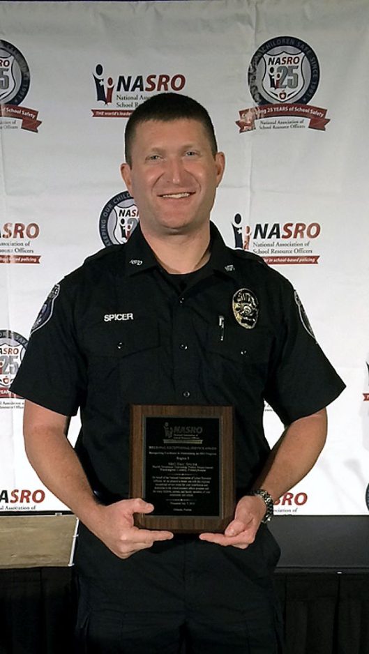 North Strabane Township police officer Eric Spicer, school resource officer at Canon-McMillan High School, received the Regional Exceptional Service Award. The award is presented to a SRO for continuous and sustained service to the school community above and beyond what is expected. The region includes Pennsylvania, New York, Delaware and New Jersey.