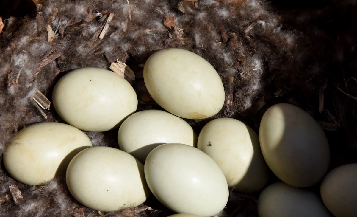 Landscapers then set up a short-term nesting area in a flower bed where the duck bedded down and laid the baker’s dozen of greyish-blue eggs. Joyce said he would set up a new, secret nesting location and place the eggs there so they have a better chance of survival. The duck and her eggs were transported separately, Joyce said, for fear the mother-to-be would become stressed and break the eggs in transit.