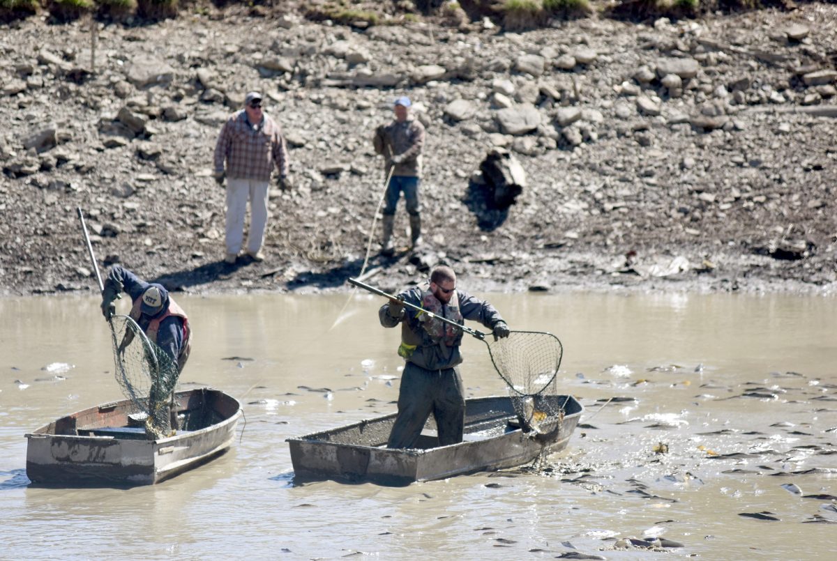 The fish inventory came to an end about 4 p.m. Wednesday, when lime was spread across the water that remained in the drained pond to kill anything the commission might have missed in the search, which involved men netting the fish in small boats in shallow water.