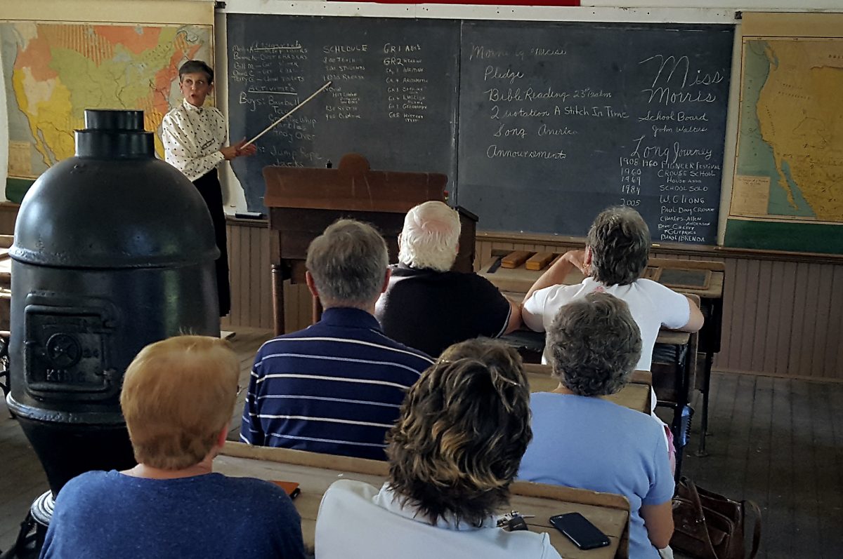 Kathy Miller spent the evening as schoolteacher “Miss Morris” as she took the “class” through a normal school day that began with the pledge of allegiance and a prayer before going into the day’s studies.