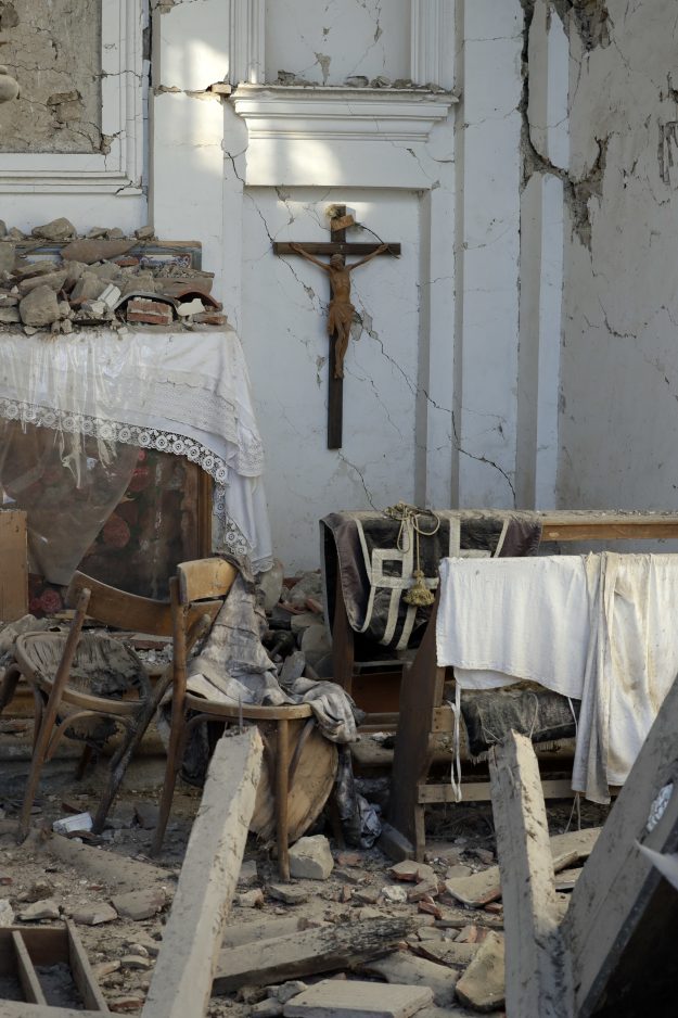 He said 15 hours after the quake struck Wednesday, he returned to the church in Pescara Del Tronto to recover its crucifix. Close by, firefighters were using their hands to dig out the two sisters.