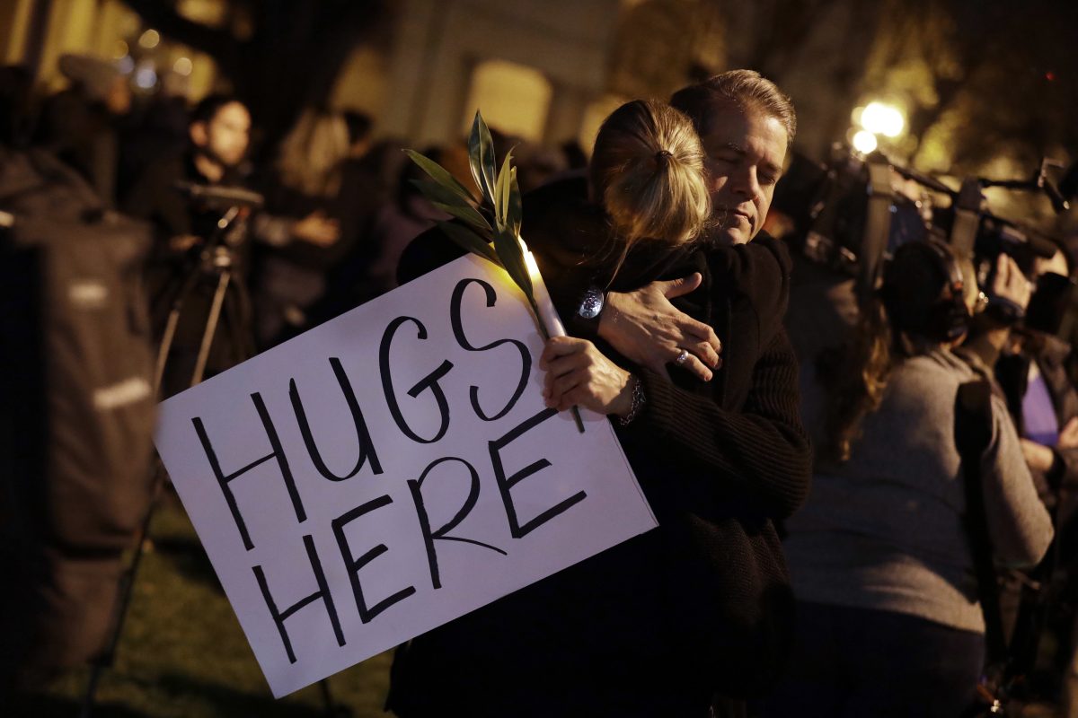 Several people in the crowd held signs offering “free hugs.”