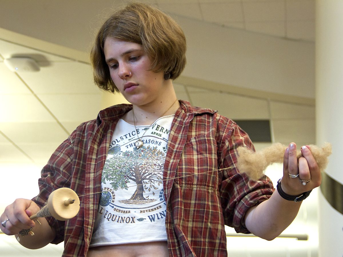“I’m here to demonstrate spinning,” said Manko as she fed wool from her sheep onto a bobbin.