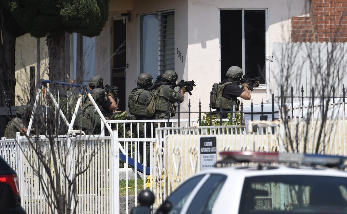 About nine hours after the shootout, heavily armed police officers surrounded a house about a half-mile away, one of them using a bullhorn to urge a man to surrender. Authorities also detonated several devices at the scene that made deafening booms.
