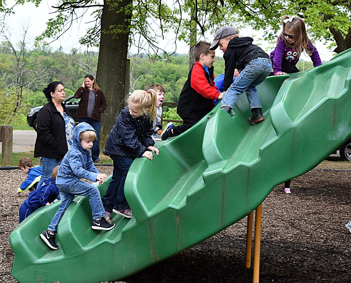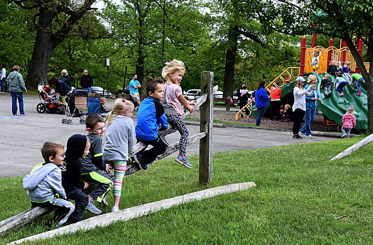 A portion of a split-rail fence has as much attraction as expensive playground equipment for youngsters during a picnic for the Church of the Covenant Preschool 3-year-old class last month at the Stone Pavilion in Washington Park. Sixty children, along with parents, participated in the picnic at the park. Sitting on the rail, from left, are 4-year-olds Carson Shore, Gabriel Antoinette, Evan Berdar, Elle Ryan, Trevor Flowers and Audrey Proudfit.