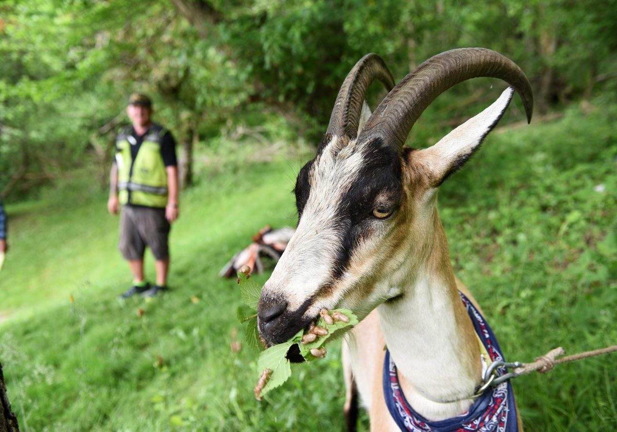 Miles, who became Wescott’s second pet goat last fall, was tied to a tree outside the hotel. Wescott’s green reflective vest, shorts and a short-sleeved black hoodie made elaborate tattoos on both knees and covering his right forearm visible. The former full-time musician said he’d spent Wednesday night near Route 19 across from Fiori’s Pizza in Peters Township until a rainstorm woke the pair and their day began at 3:30 a.m.
