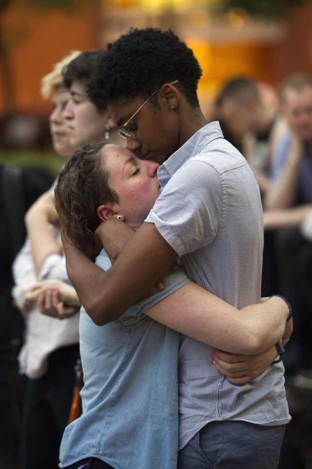 Hundreds of people gathered Monday night in Boston. Many carried rainbow-colored flags and signs calling for peace. At times they held and comforted each other. Speakers addressed the crowd in both English and Spanish.