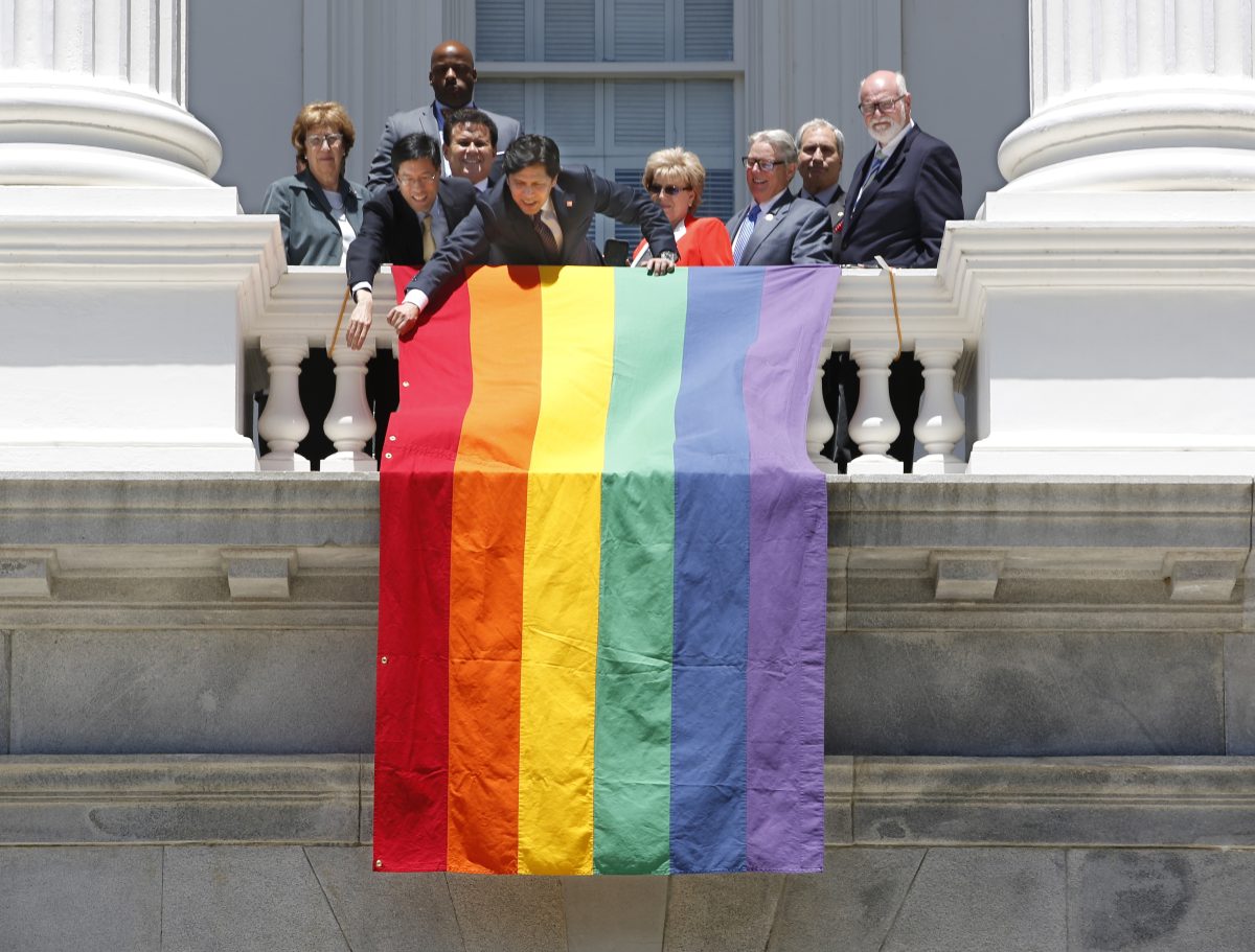 The rainbow colors of the gay pride flag flew on the side of the California Capitol and on the floor of the Senate – a first for the Senate, according to President Pro Tem Kevin de Leon, a Democrat.