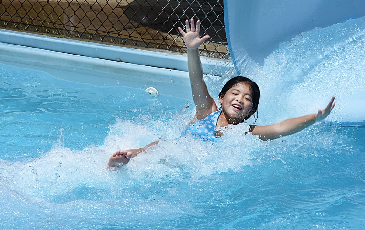 In this file photo from summer 2016, Ivy Zheng slides with a splash into the Washington Park swimming pool.