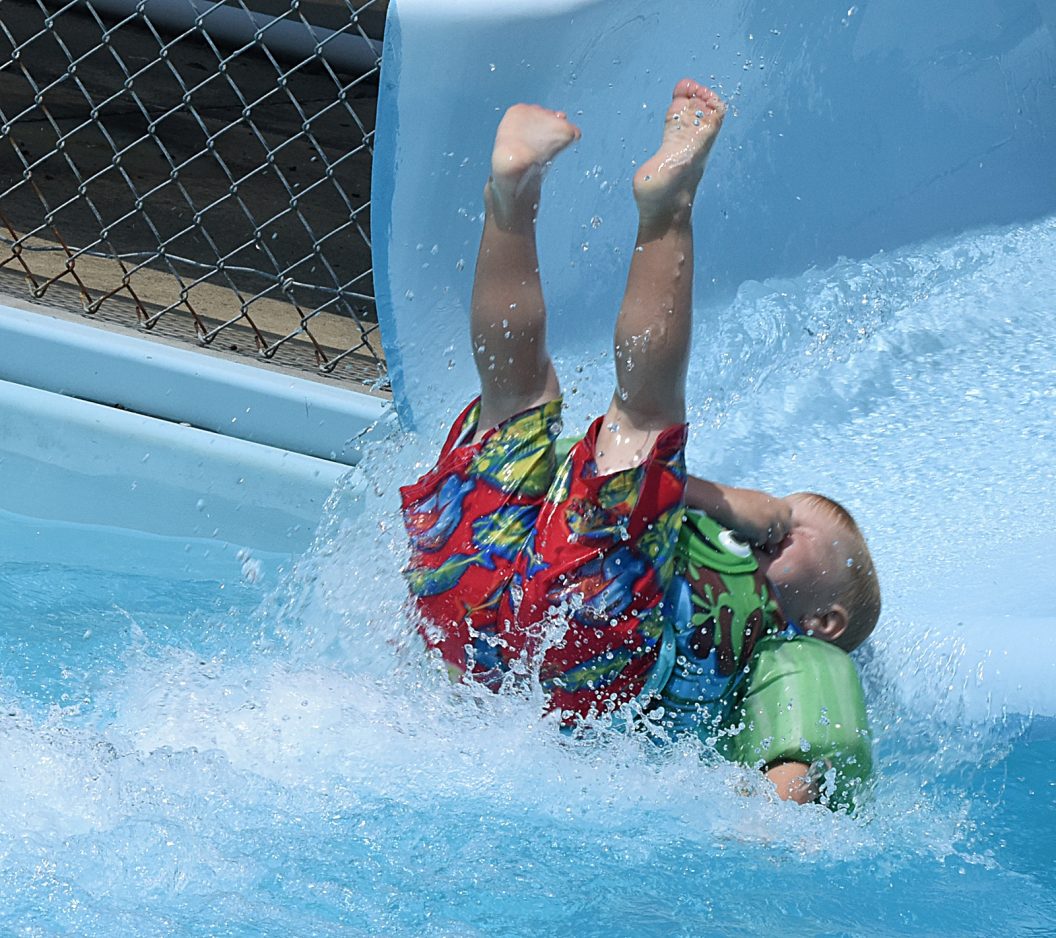 Foster Smith, 4, takes a different approach to sliding into summer with his feet in the air as he splashes into the Washington Park pool Monday. Foster was at the pool with his brother, Fox Smith, 6, and mother, Jillian Smith of Houston.