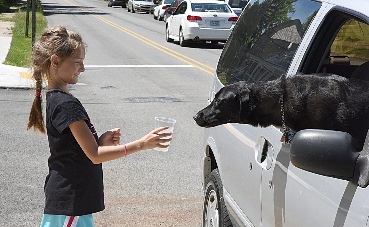 Chevelle Chase, 9, daughter of Jane Chase and Laverne Davis of East Washington, is ready to hand a glass of lemonade to Jim Kohler of Washington, but his dog, Ducy, has other ideas about quenching his thirst first. Chevelle did a brisk businesss with her lemonade stand at the corner of North Avenue and East Chestnut Street.