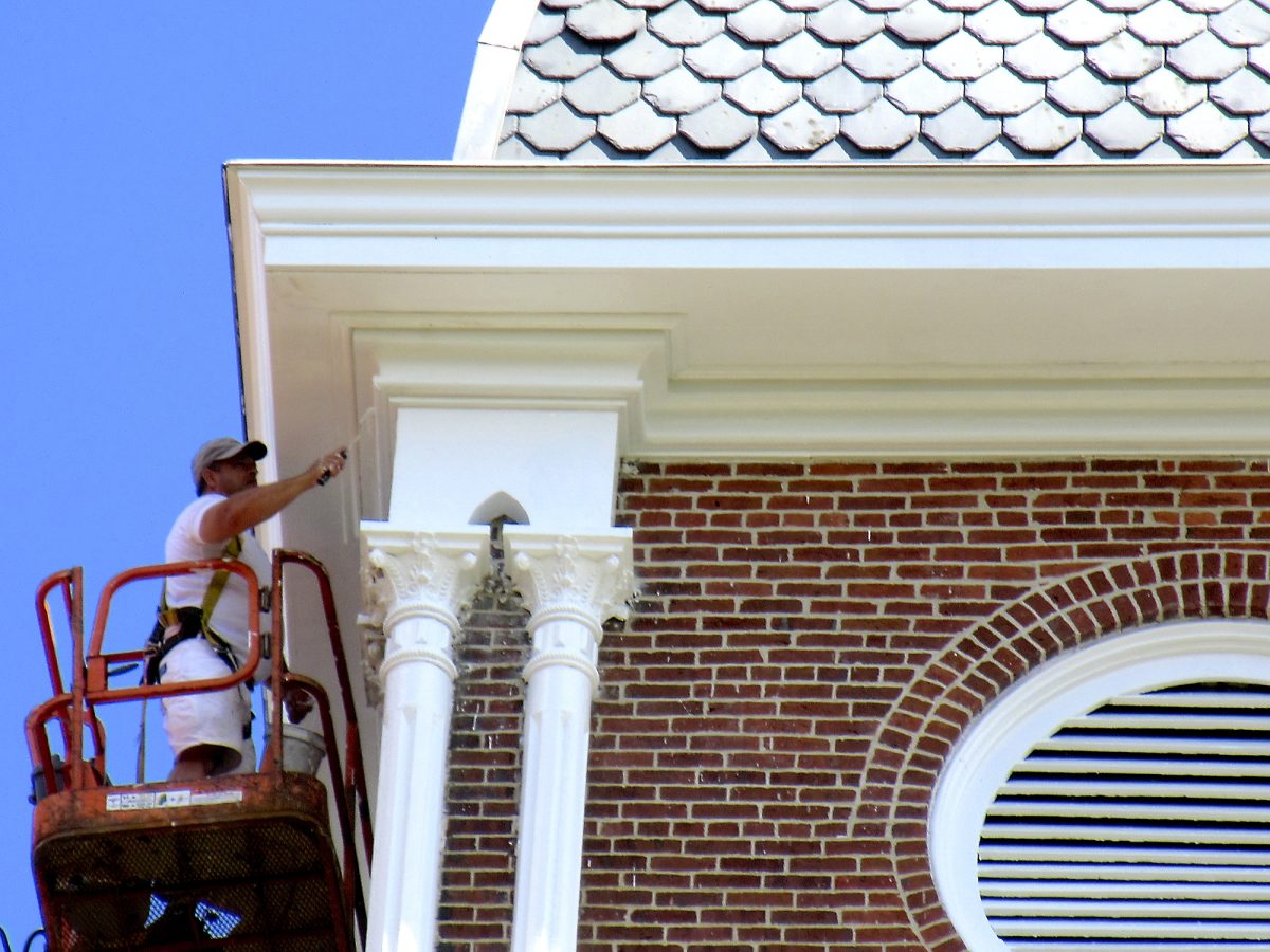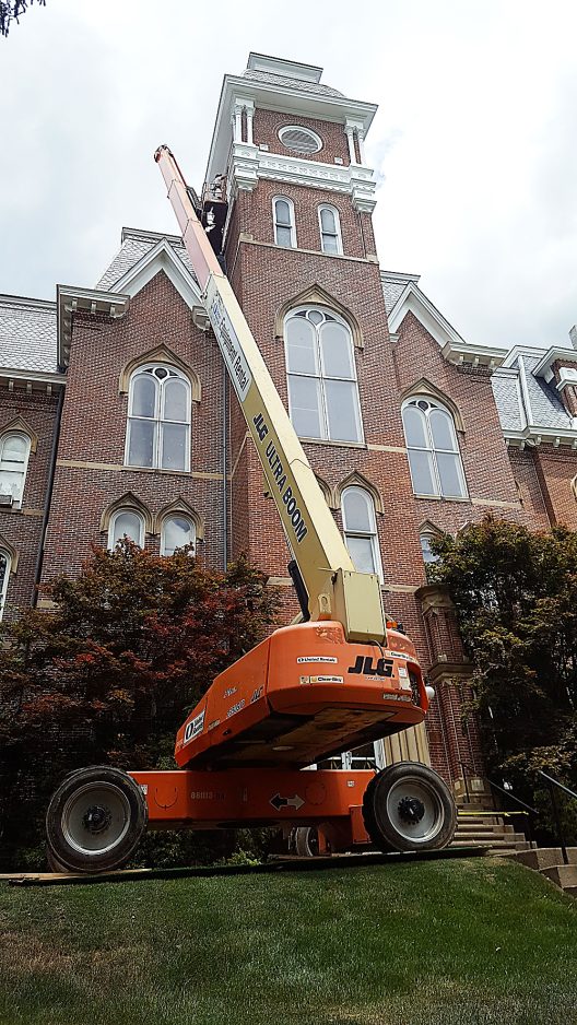 Mike Jones/Observer-Reporter A painter reaches to lather on a coat of white paint on Miller Hall’s belfry high above Waynesburg University’s campus while working Wednesday to spruce up the wood framing on the school’s administrative building.