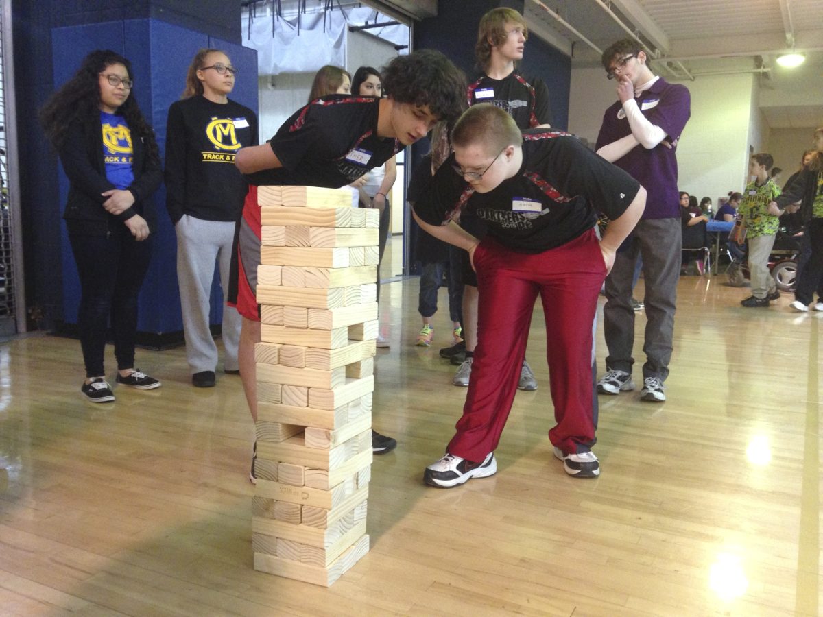 A majority of the eight challenges also tasked students with using coordination and balance. One example was “Magic Carpet,” in which even students seated in wheelchairs participated by collectively flailing a tarp with two balls upward to keep the balls aloft. Other challenges were a mix of pre-planning and execution, like “Giant Jenga.”