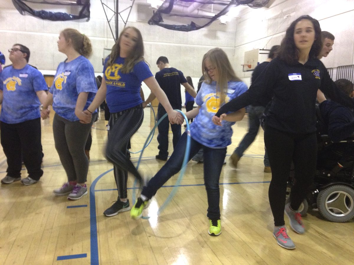 CANONSBURG – Students from 11 school districts joined hands, danced and collaborated in various team tests in Canon-McMillan’s “C-M Challenge” Thursday as the district hosted special-needs students and their student mentors. Some challenges were variations on schoolyard games like “Don’t Step on the Lava,” renamed “Hot Chocolate River,” as students tossed discs they then had to step on to help themselves and teammates make a crossing.