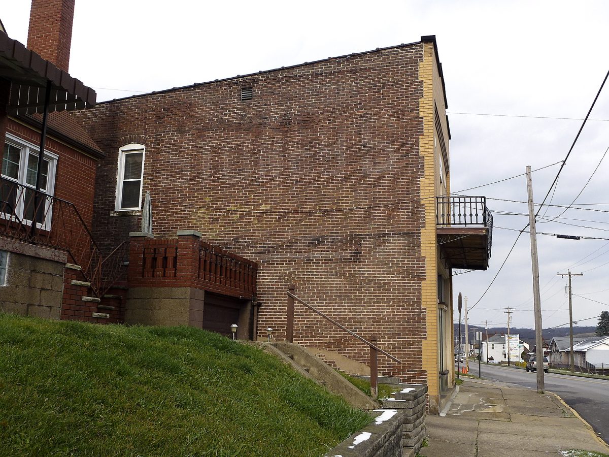 On East Strawberry Avenue, a person can barely make out the name “McVehil,” although on the Shaffer Avenue side, a sign painted in the 1950s is very visible as the “Home of McVehil Plumbing, Heating and Supply Co. Inc.” Below it is a newer advertisement for another East Wheeling Street business, Countryside Frame Shop and Gallery. Countryside Frame has also left a ghost sign on the Shaffer Avenue side of its former building across East Wheeling Street.