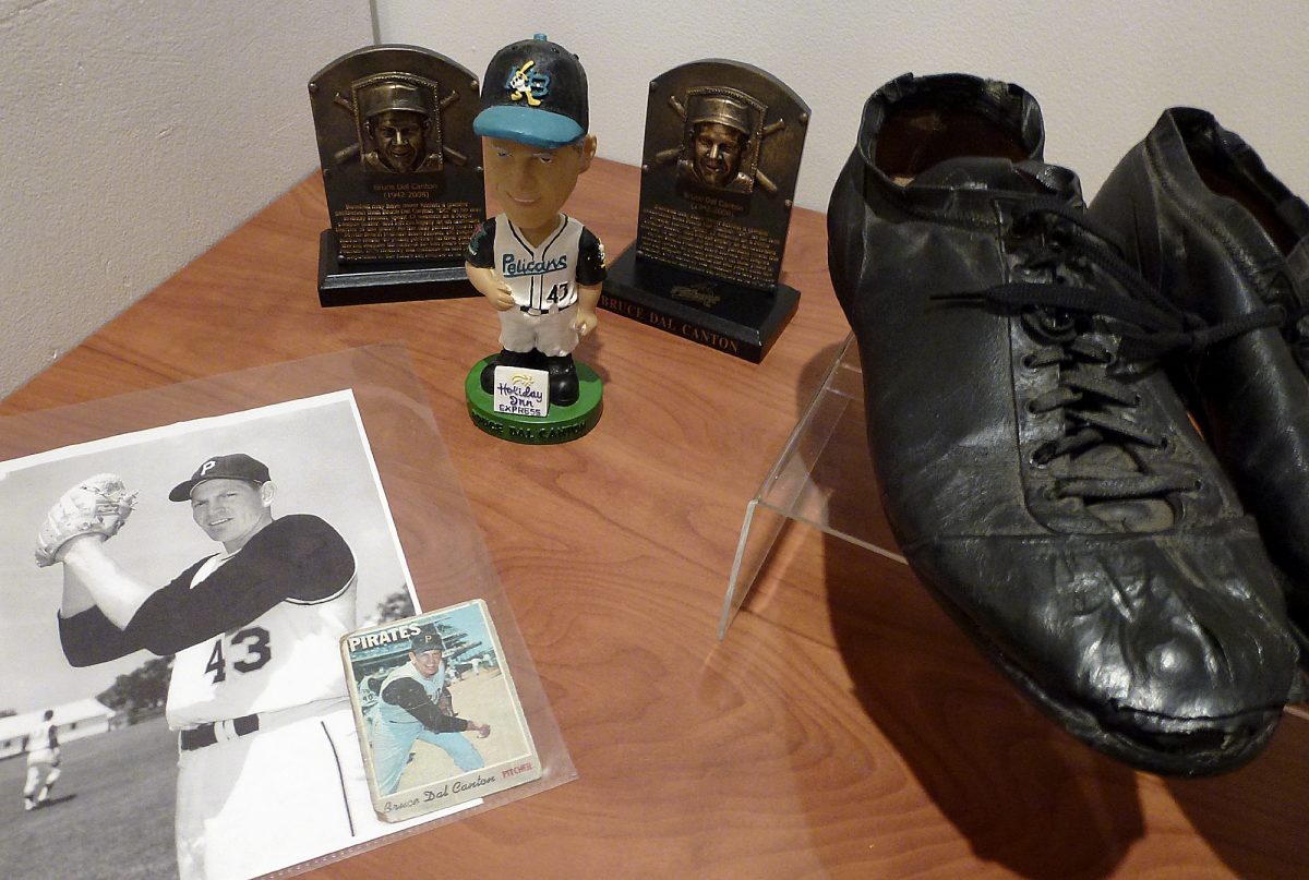 California Area Historical Society features borough native Bruce Dal Canton, who pitched for 12 seasons for major league teams, including the Pittsburgh Pirates. His worn-out leather game shoes are on display, along with one of his bobbleheads.