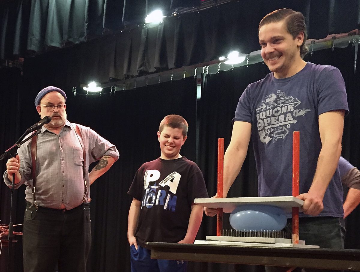 Sixth-grader Samuel Wilson came onstage when surface pressure distribution was being demonstrated. He agreed that the nails were sharp as inflated balloons were squeezed, first against a board with one sharp nail in it. So how much pressure before it popped? Not much, the students learned.