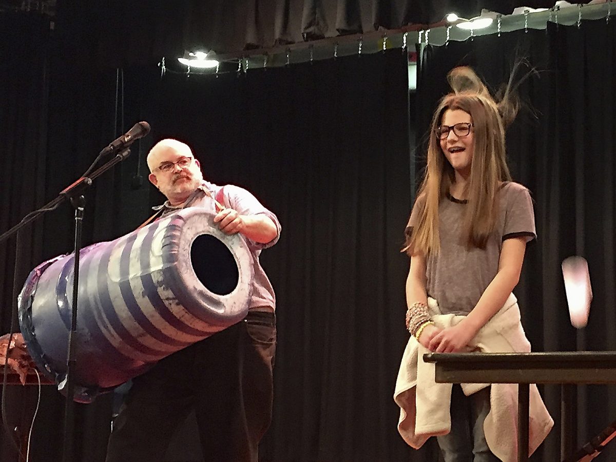 Sixth-grader Olivia Kiger’s long hair helped show air pressure in motion as O’Hearn thumped a large open ended drum with enough force to blow her hair up while knocking the paper cup off her head. In order to see this force better, smoke was added to the mix and Kiger and O’Hearn thumped smoke rings into the audience. Later, a canister of carbon dioxide was used to prove that this unique gas gets very cold under pressure. Soon snowflakes were shooting up into the air, with plenty of drumrolls and shouts from the kids.