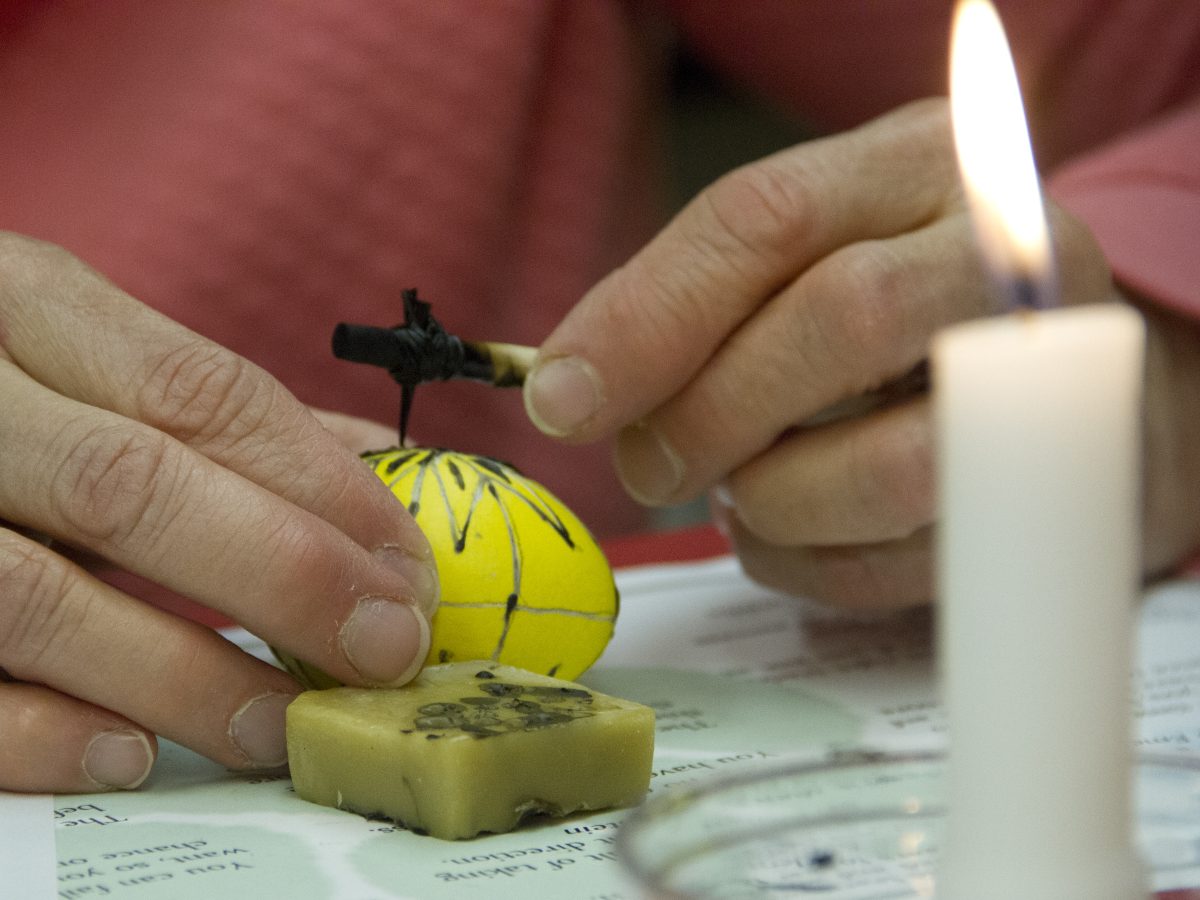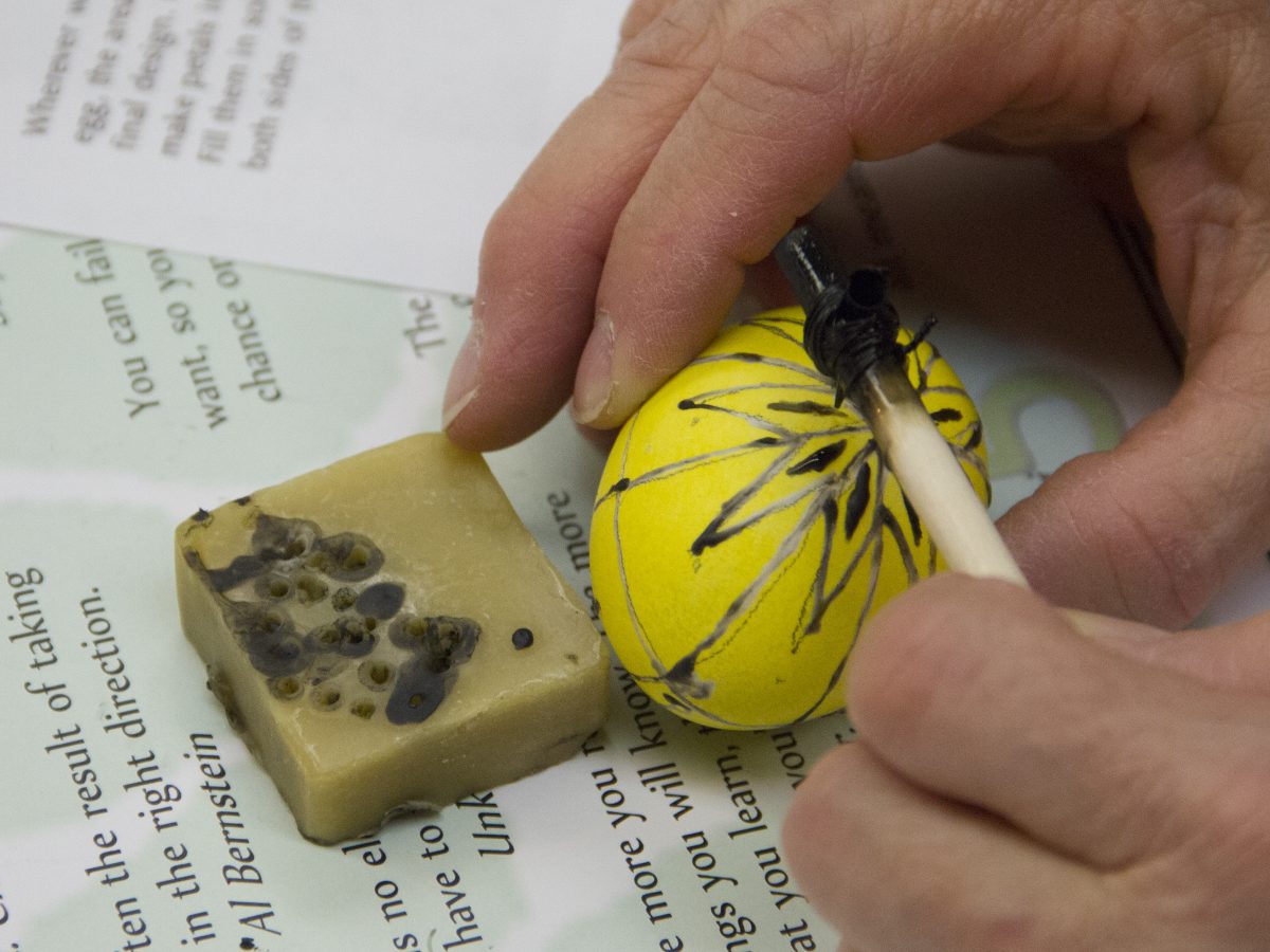 Traditional pysanky designs were available for workshop participants to follow, and 8-year-old Liliana D’Andrea chose one featuring a star pattern with ovals, in layers of orange, red, yellow and green.