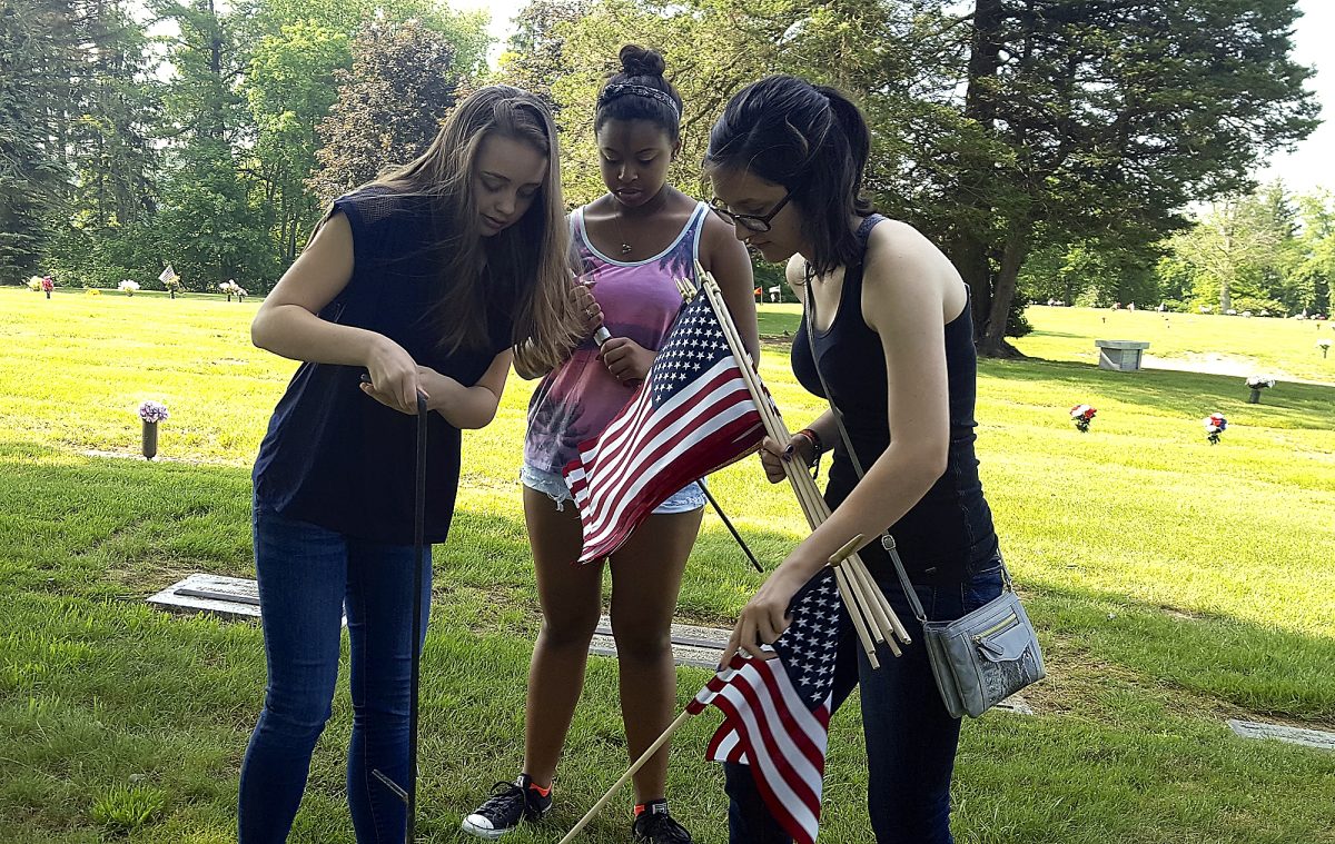 Bria worked in a team with fellow eighth-graders Shelby Burkett and Adia Eilam as they scouted for veterans’ grave before using a long metal pole to soften the spot where the flag was inserted. All three girls said they had grandfathers who served, making the occasion especially personal.