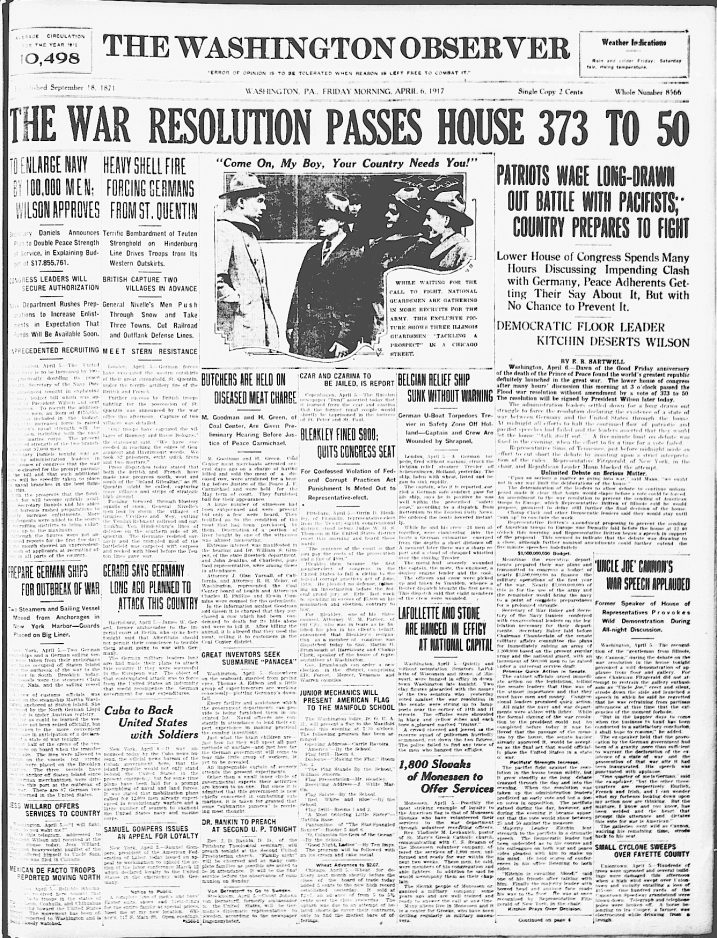 This week, the United States is marking the 100th anniversary of when the country entered World War I. Pictured here are articles, photos, ads, and newspaper front pages from the Washington Observer and Washington Reporter newspapers from early April, 1917, that give you a glimpse of life during this historical era.