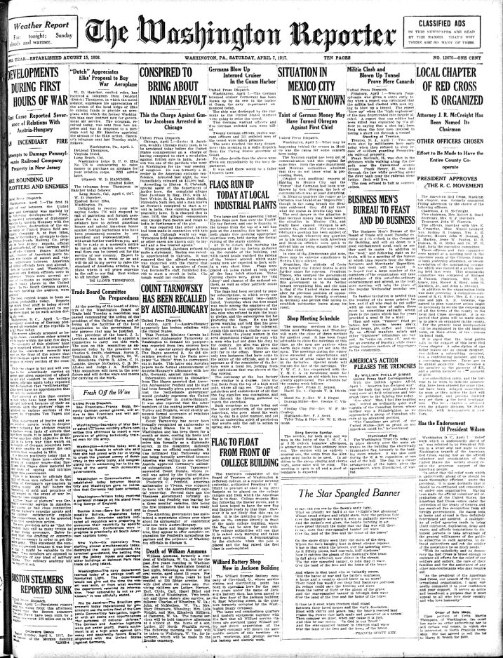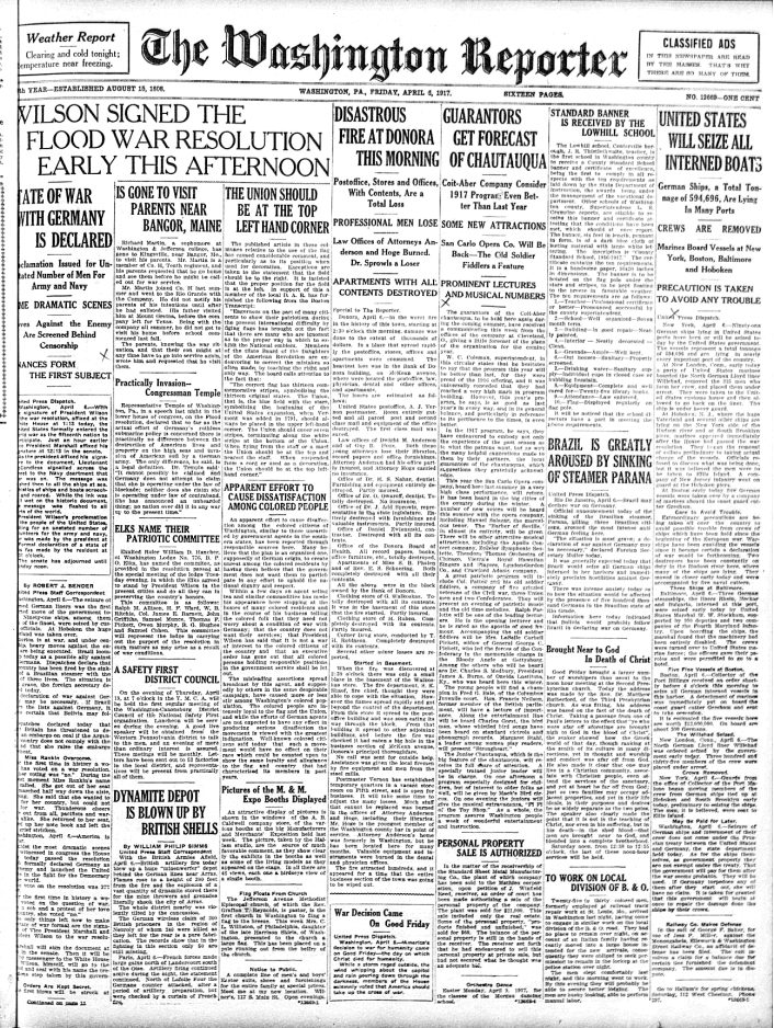 This is the April 6, 1917 front page of the Washington Reporter.
