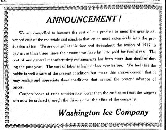 This ad for The Washington Ice Company shows how the war effected the home front. The ad talks about why they are raising their prices.