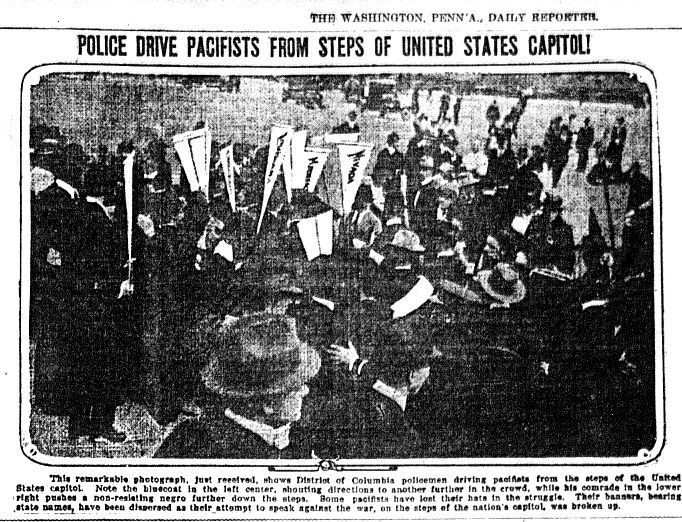 This photo from the Washington Reporter depicts police friving off pacifists on the steps of the U.S. Capitol building.