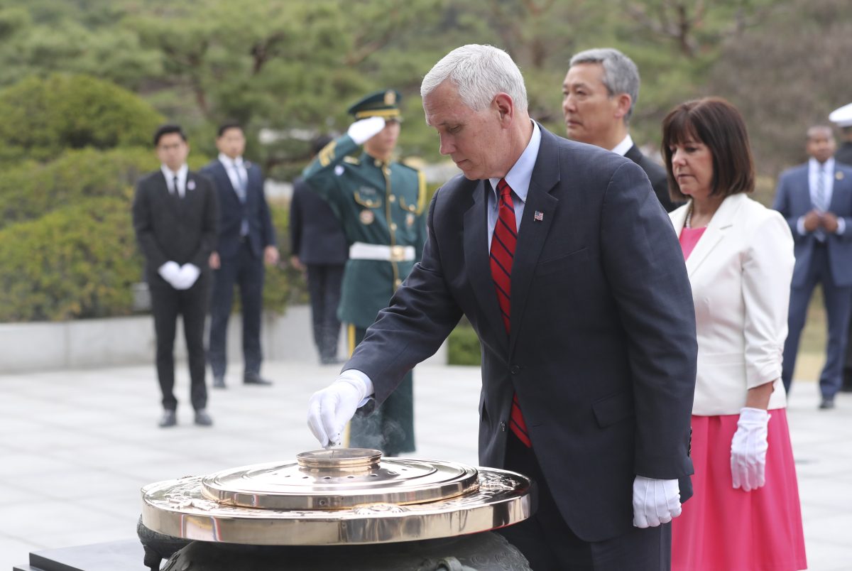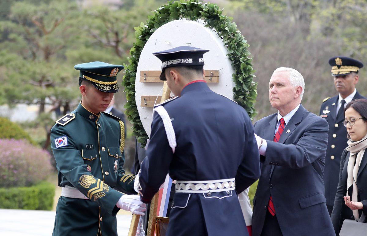 Into this tense environment, Pence made his first trip to the region since taking office in January. After arriving in the South Korean capital, he placed a wreath at Seoul National Cemetery and then worshipped with military personnel at an Easter church service at the U.S. Army Garrison Yongsan.