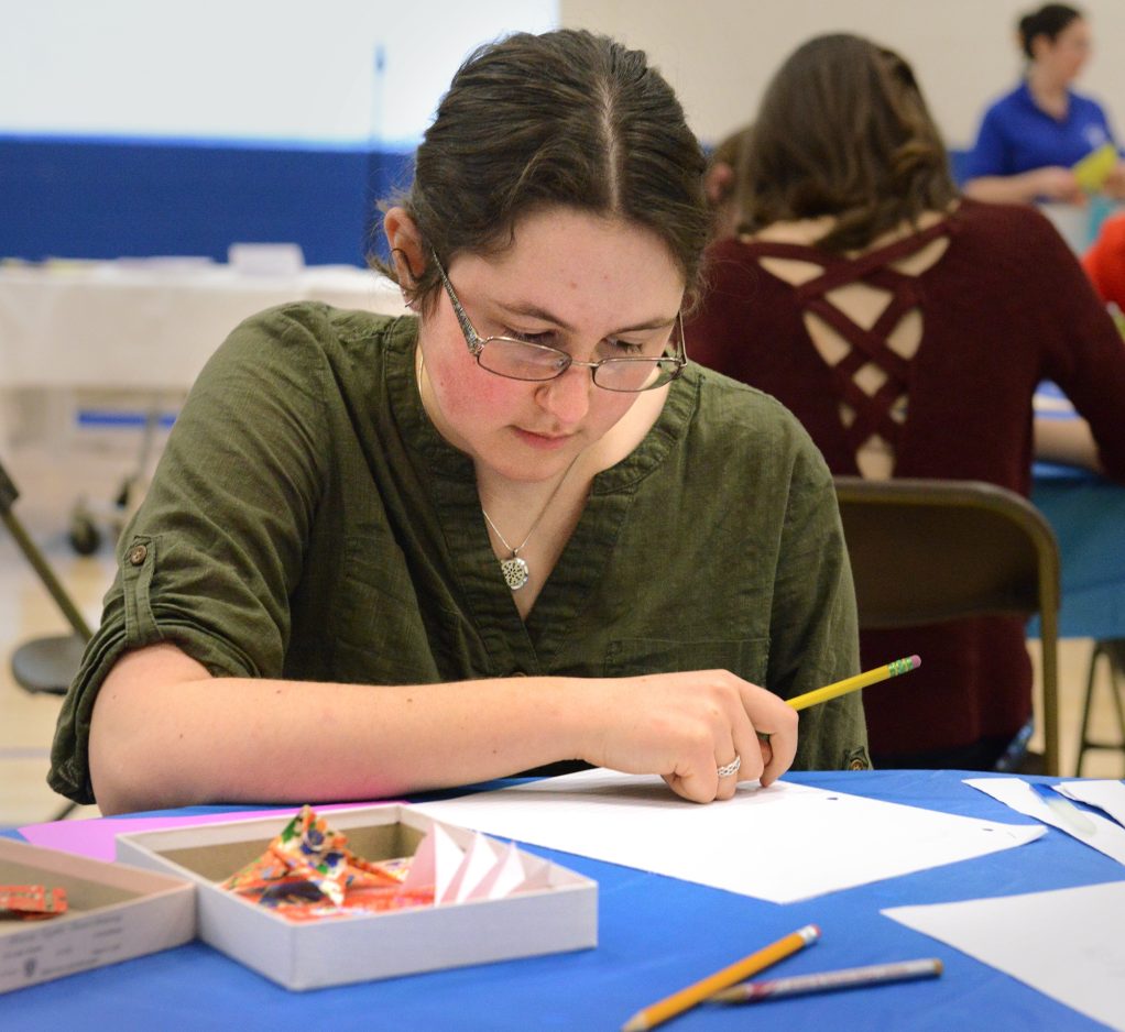 Linnea Asplin competes as part of the Trinity High School team at Mathematics Council of Western Pennsylvania finals held at Trinity Monday. Between rounds, Asplin stayed sharp by occupying her time with poetry and origami.