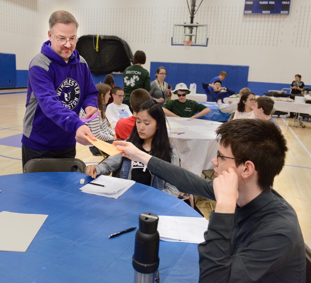 Mike Davidson, left, a math teacher from Winchester-Thurston, collects an answer sheet from William Lee-Moore, one of his students, at math event. Teams from 12 schools in the southwest region met at Trinity for the competition, representing the top-scoring teams in each of the eight sections of the region.