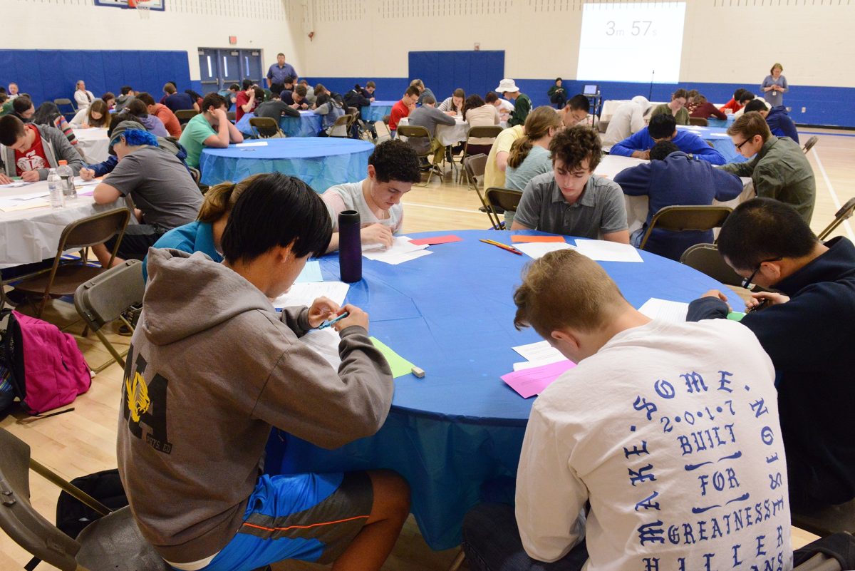 Math students from across the region gathered in the auxiliary gym at Trinity High School for the finals of the Mathematics Council of Western Pennsylvania competition Monday. Teams from Shadyside Academy and North Allegheny tied for first place, followed by Allderdice, Upper St Clair and Franklin Regional.